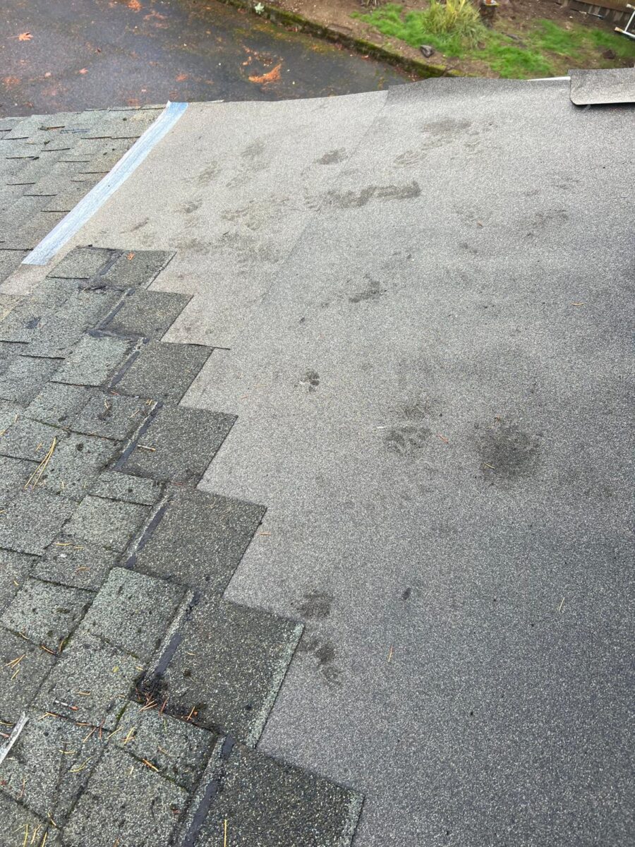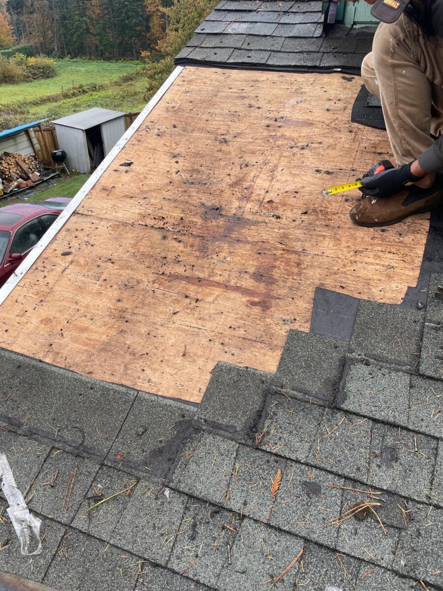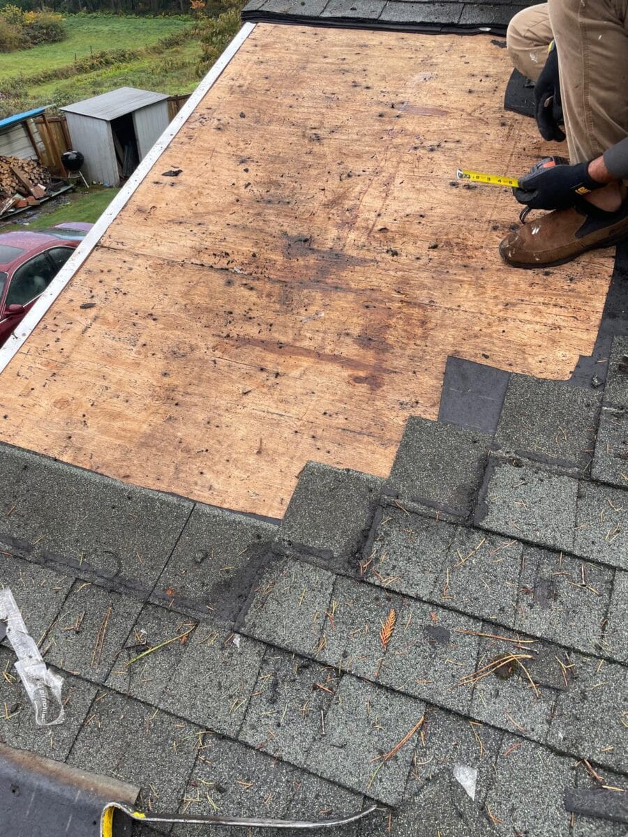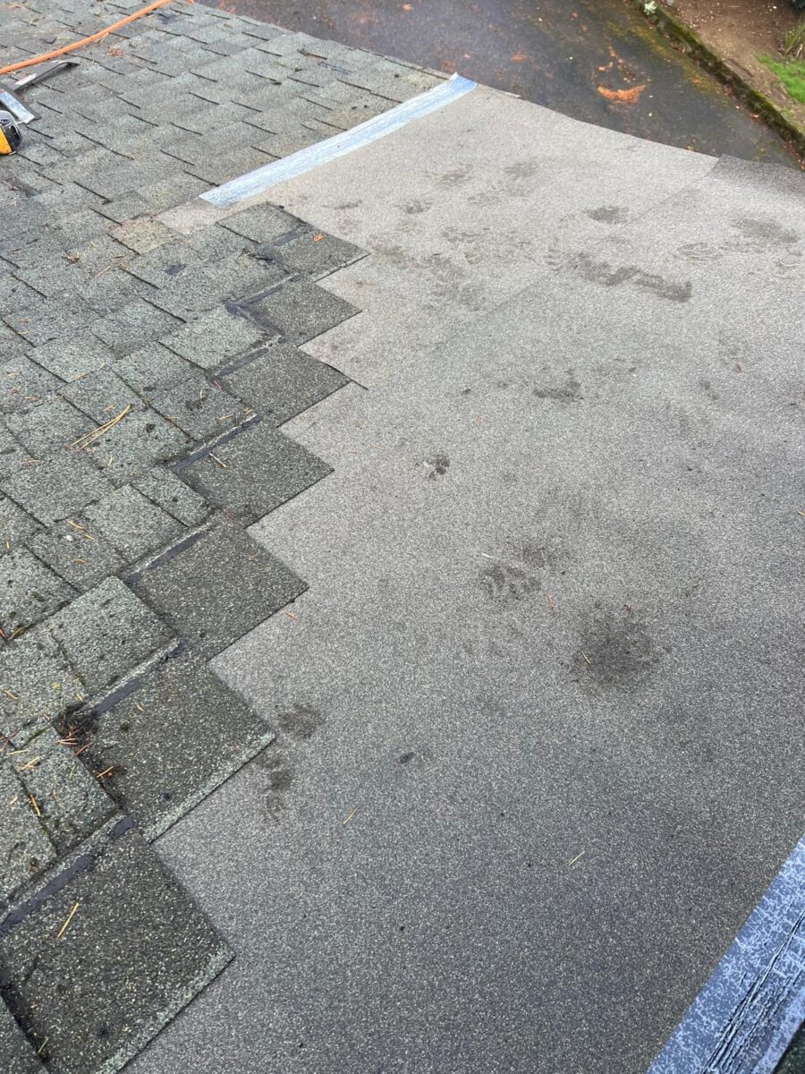 underneath. Our crew began by carefully removing the damaged shingles and underlayment,